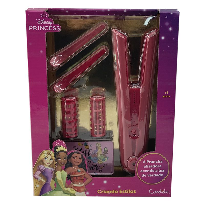 Dê vida a penteados encantados com o Conjunto de Beleza Criando Estilos Disney Princesas! Inspirado nas personagens mais amadas dos contos de fadas, o kit inclui prancha de alisar, 2 rolos de cabelo e 2 presilhas para criar visuais dignos da realeza. E o melhor é que ele já vem com pilhas e está prontinho para começar a diversão! Um mundo mágico de estilo e imaginação espera pelas pequenas princesas!