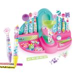 Com mais de 150 acessórios inclusos, as crianças podem montar 6 canetas únicas e 2 marcadores incríveis, decorando com letras, glitter, charms e adesivos. A base funciona como uma estação de montagem com funil e suporte, facilitando todo o processo.