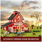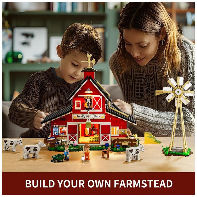 O conjunto de blocos de montar FUNWHOLE Celeiro de Vacas reproduz um celeiro clássico americano vermelho com telhado simétrico de duas águas, utilizando peças de telhado em chapa de aço colorida para maior realismo arquitetônico. Inclui moinho de vento e estrutura em dois níveis: nível inferior com curral para duas vacas, cama, cochos de alimentação e água, armazenamento de leite; nível superior para estoque de ração, com pilha de palha e carrinho removível para simulação de preparo de alimentação.