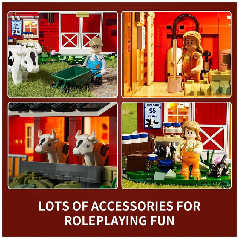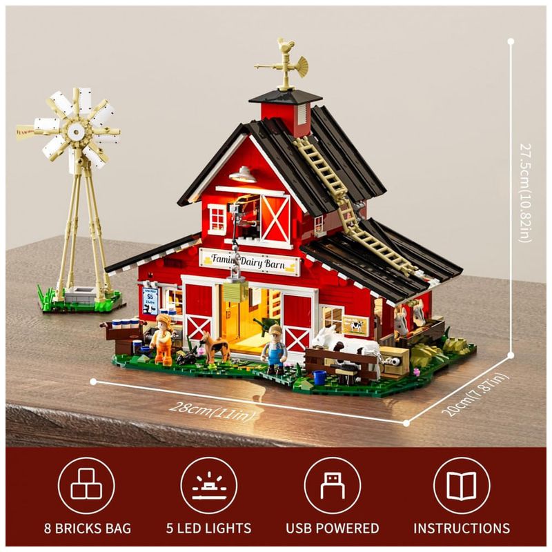 O sistema de iluminação LED exclusivo compreende quatro cordões com cinco pontos de luz personalizados: luz externa, tiras luminosas em cada andar, e luzes individuais no escritório e área de armazenamento de leite, criando efeitos de iluminação branca quente. Fabricado em plástico ABS intertravado, o conjunto de 1368 peças requer montagem manual avançada e é compatível com a série de fazenda (galinheiro e loja rural).