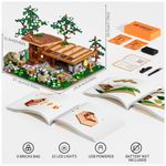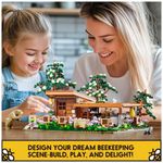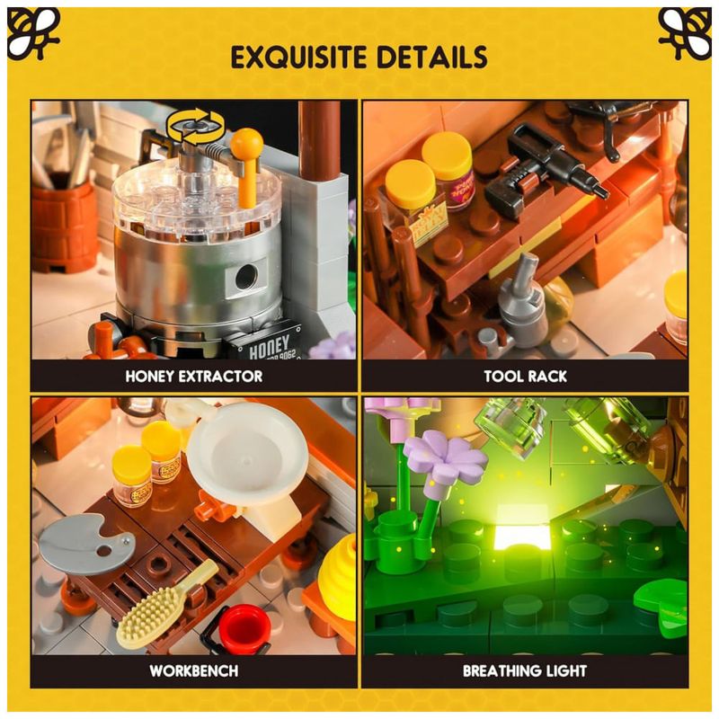 Composto por 1274 peças de plástico ABS intertravado, o kit também inclui modelos de animais como 11 abelhas, gato, urso, pássaro e vaga-lumes com efeito de luz respiratória, criando um cenário dinâmico e realista de fazenda apícola.