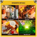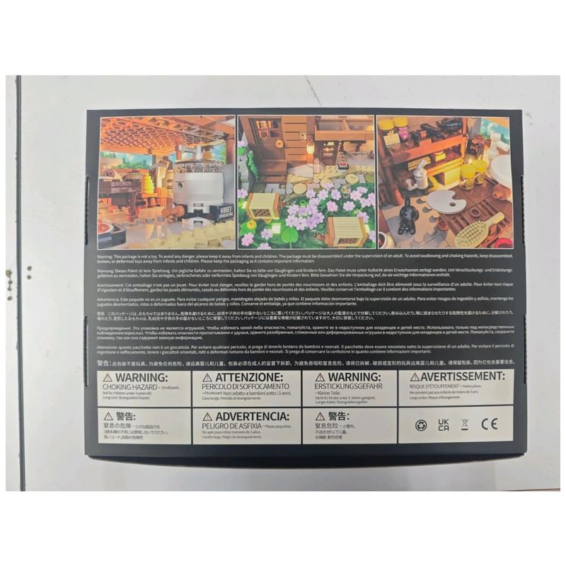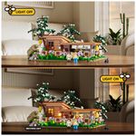 A construção modular oferece design de fácil desmontagem, com árvores e telhados removíveis para acesso aos interiores detalhados da cabana e depósito de ferramentas. A iluminação LED exclusiva possui 10 pontos luminosos distribuídos pelo campo de flores e edificações, com efeitos visuais que simulam vaga-lumes em ambiente noturno e luzes quentes em áreas internas, promovendo uma ambientação visual sofisticada.