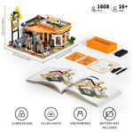 A construção apresenta teto removível, piso retrátil na loja e laterais que abrem na garagem, facilitando acesso aos interiores. Fabricado em plástico ABS de alta resistência, o kit de 1608 peças é compatível com montagem manual avançada, acompanhando manual de instruções e kit de iluminação LED. Tempo estimado de montagem: 8 horas.