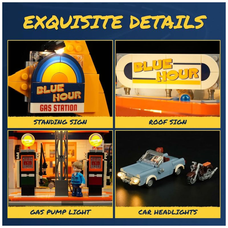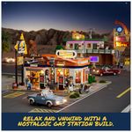 O sistema de iluminação LED integrado compreende luzes na cobertura estilo vintage, logotipos iluminados nas bombas de combustível e faróis dos veículos, criando efeitos visuais detalhados. A estrutura modular permite interatividade com mangueira simulando abastecimento real, elevador hidráulico na garagem para levantamento de veículos, prateleiras na loja, balcão de checkout e racks de ferramentas.