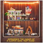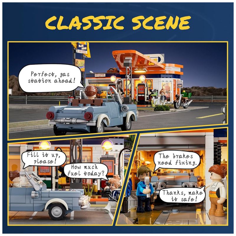 O conjunto de blocos de montar FUNWHOLE Posto de Gasolina reproduz uma estação de serviço retrô inspirada nos anos 1960, com detalhes arquitetônicos como cobertura triangular, sinalização de estrada vintage e layout completo de área de abastecimento, loja de conveniência e garagem de reparos. Inclui dois veículos personalizados: um carro clássico de 6 larguras e uma motocicleta, além de 21 peças impressas com padrões azul-laranja retrô para maior realismo.