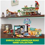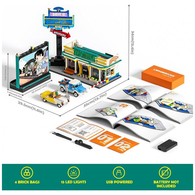 Conjunto de blocos de montar para adultos e adolescentes com 1760 peças que reproduz um cinema drive-in de estrada, com prédio de conveniência, grande painel de tela, letreiro retrô iluminado e área de estacionamento para veículos. O cenário segue estética rodoviária clássica, com estrutura compacta para lanchonete/loja, detalhes de fachada e base preparada para posicionar carros em frente à tela.??