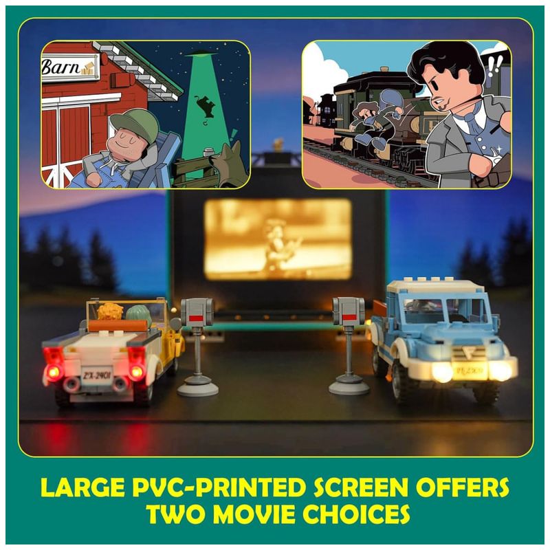 O modelo utiliza um painel de tela em PVC de grande formato, reversível, que simula a projeção de filme em drive-in e pode ser alternado entre duas cenas impressas. O conjunto inclui dois veículos em estilo retrô (picape e sedã), que podem ser posicionados livremente na base para compor cenas de sessão noturna.??