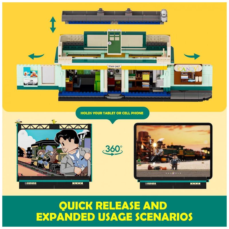 O sistema de iluminação conta com aproximadamente 15 pontos de LED, distribuídos em letreiro neon, elementos da construção e veículos, criando efeito de brilho típico de fachadas iluminadas de cinema de estrada. A tela também pode atuar como suporte para telefone ou tablet, permitindo uso funcional como base para reprodução de mídia em contexto de decoração temática.??