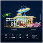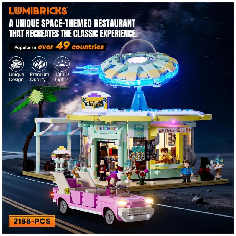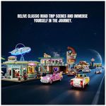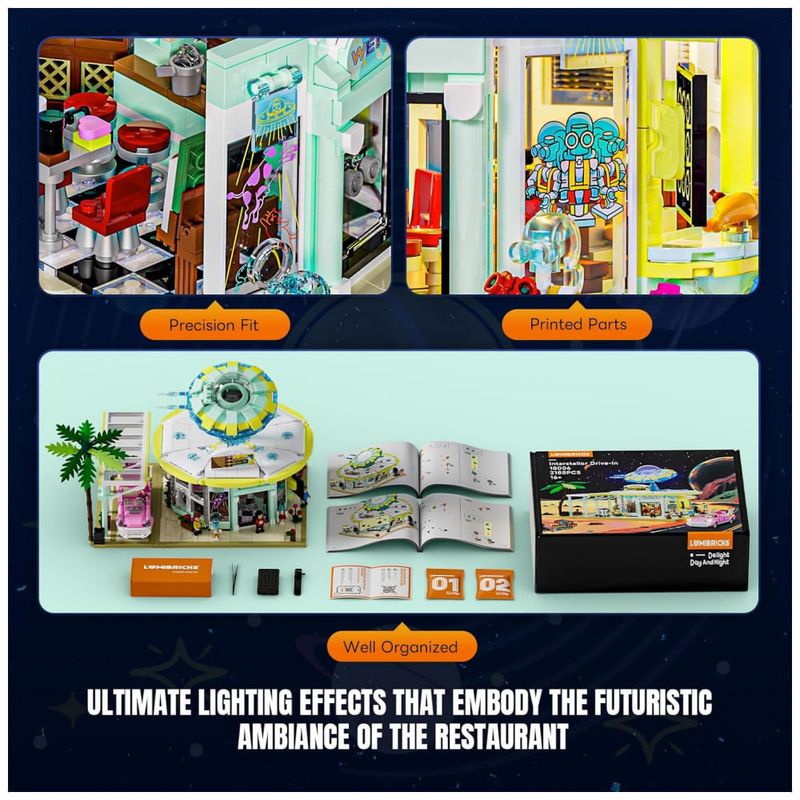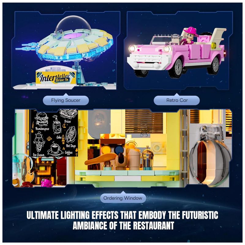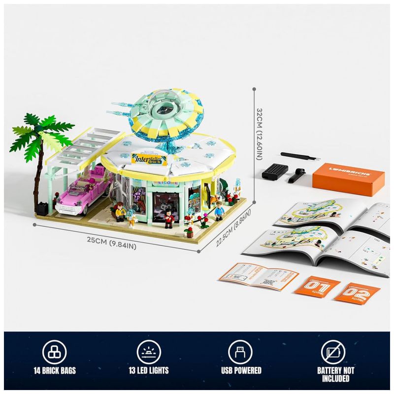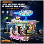 Conjunto de blocos de montar modular com 2188 peças que reproduz um restaurante drive-in em formato de disco voador, combinando elementos retrô e futuristas em um cenário urbano de temática espacial. A estrutura circular tipo diner é encimada por um UFO com letreiro iluminado, criando um visual tecnológico indicado para exposição em coleções adultas.?
