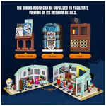 O módulo superior, formado pelo UFO e pelo telhado, pode ser removido em uma única peça para acesso ao interior detalhado do restaurante. A base do edifício é articulada para abertura em 180 graus, permitindo visualização plena de áreas internas e facilitando a montagem, inspeção e exibição do cenário.?