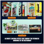 O sistema de iluminação integrado utiliza 14 pontos de luz LED distribuídos em UFO, letreiros e áreas do restaurante, com predominância de tonalidade azul fria para reforçar a estética sci-fi e retrô-futurista. O modelo é recomendado para adultos e entusiastas de cenários urbanos e viagens, funcionando como peça de exposição e projeto detalhado de montagem.?
