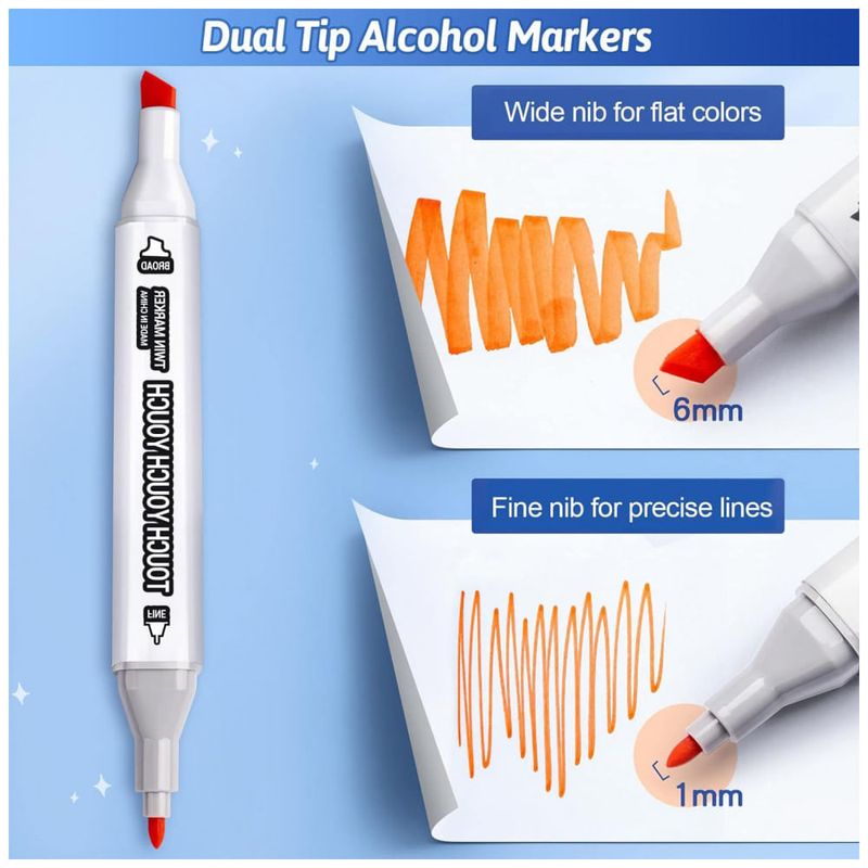 Marcadores de álcool de ponta dupla exclusivos: Marcadores de álcool com dois tipos de pontas, uma ponta fina cerca de para linhas precisas e uma ponta larga cerca de para cores planas, para atender a todas as suas necessidades de pintura.