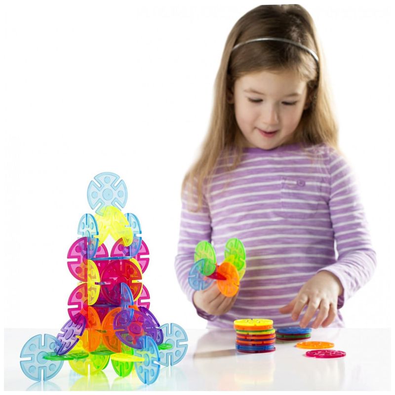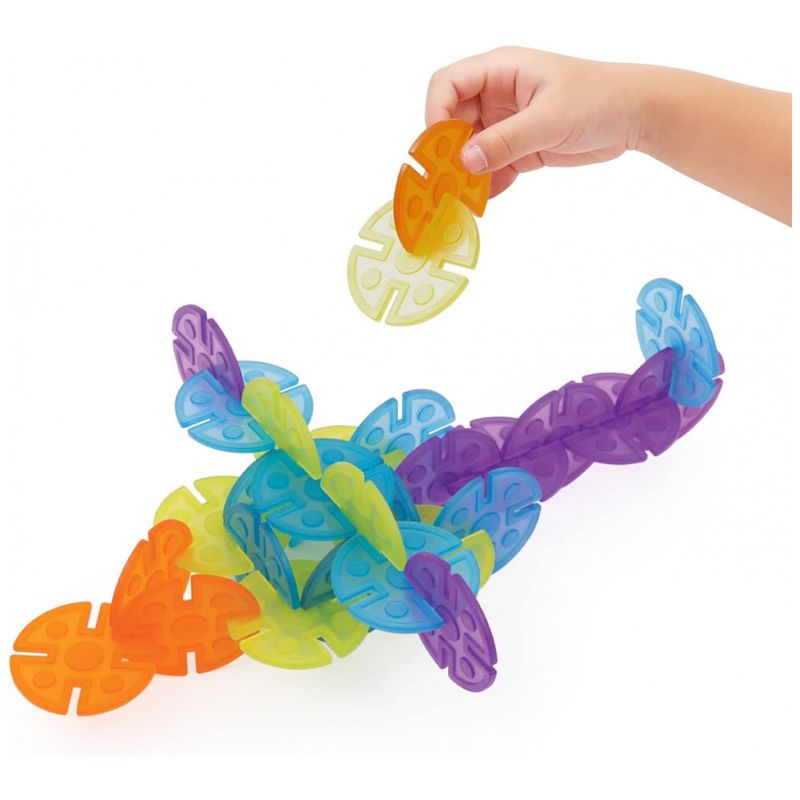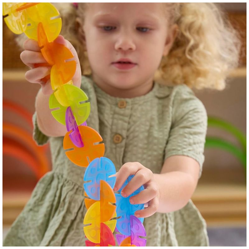 O Guidecraft Interlox Discs é um conjunto de construção com discos plásticos translúcidos que se encaixam pelas bordas, indicado para crianças a partir de 2 anos, permitindo criar estruturas abertas em diferentes direções. As peças circulares possuem várias ranhuras ao redor, o que facilita conexões em múltiplos ângulos e a formação de construções mais complexas, como torres, flores, figuras abstratas e elementos geométricos.?