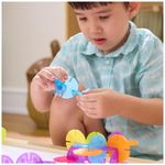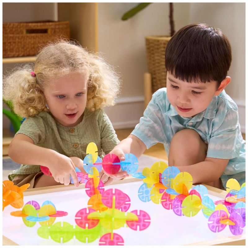 Os 96 discos estão distribuídos em cinco cores vibrantes, com relevos geométricos em cada peça, favorecendo exploração de simetria, combinação de cores e equilíbrio em contextos de aprendizagem STEM. As peças podem ser usadas sobre mesas de luz para atividades de cor e transparência e são compatíveis com o conjunto Interlox original, ampliando as possibilidades de construção quando os dois sets são combinados.?