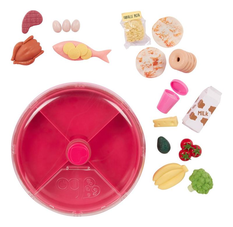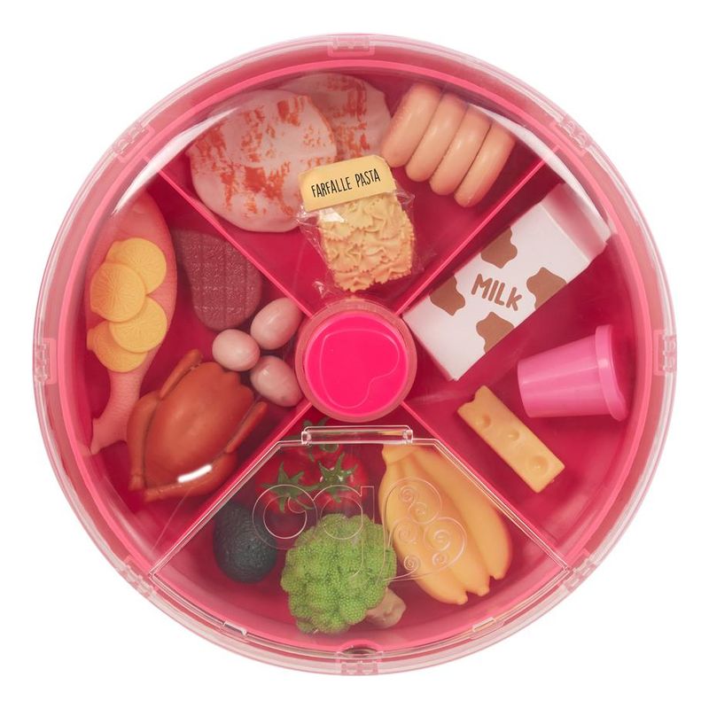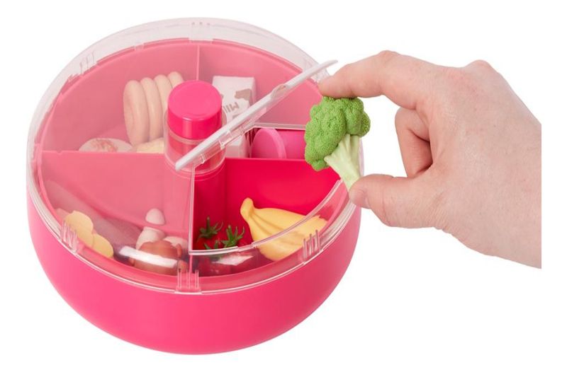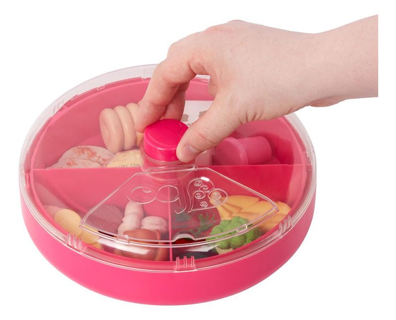 Explore novas aventuras culinárias com o conjunto de brinquedos Spin & Serve da Our Generation! Este estojo de armazenamento em miniatura permite que jovens chefs organizem e guardem seus ingredientes favoritos enquanto mantêm a diversão em alta rotação. Com quatro compartimentos, você pode organizar os 18 itens de comida de brincar incluídos. Basta girar a parte superior para acessar os alimentos quando for hora de cozinhar! A tampa do estojo possui uma abertura para que as crianças possam pegar facilmente os itens de comida. Este acessório de comida de brincar é perfeito para ensinar às crianças sobre os diferentes grupos alimentares e pode ser facilmente incorporado aos seus conjuntos de cozinha de boneca.