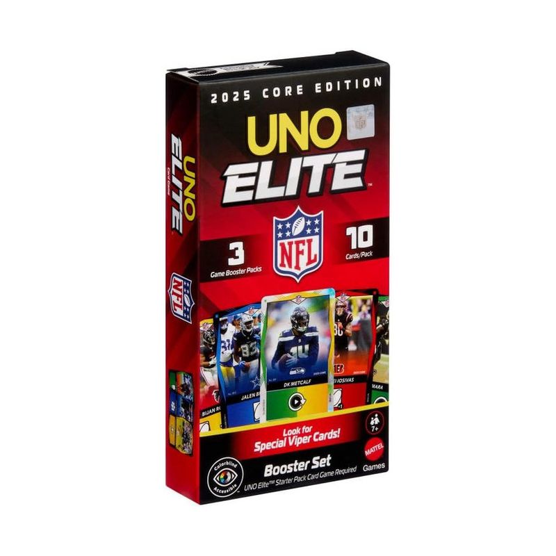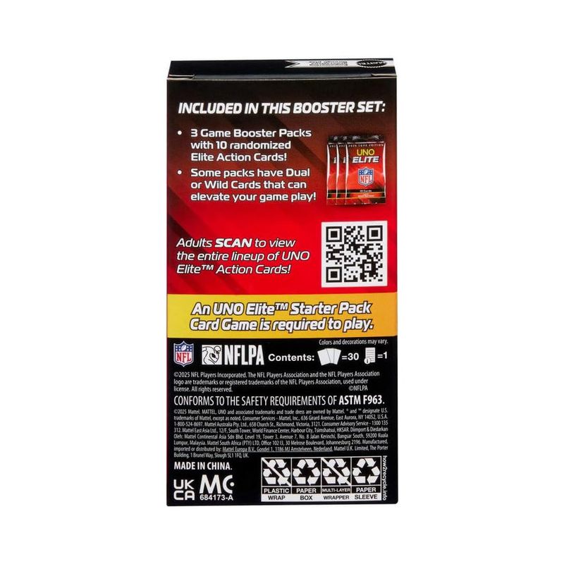 Kit de expansão oficial da NFL para o UNO Elite, com 3 pacotes contendo 10 cartas de Ação Elite cada, totalizando 30 cartas extras.