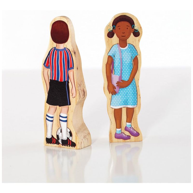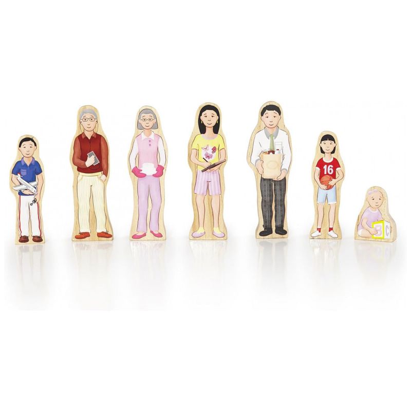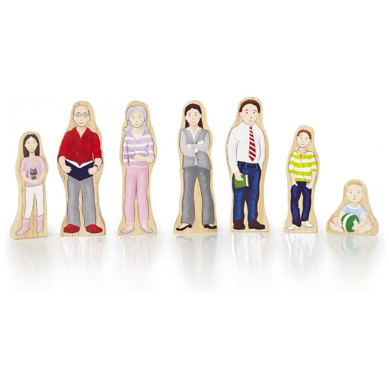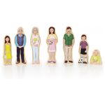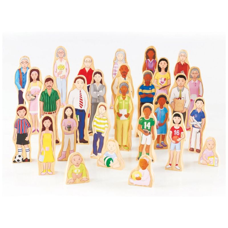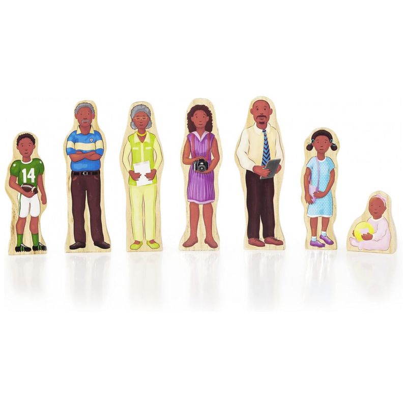 Conjunto de personagens em madeira maciça para brincadeiras de faz de conta e uso em conjunto com blocos de construção, indicado para crianças a partir de 2 anos. As peças representam famílias de diferentes origens étnicas, incluindo grupos afro-americanos, caucasianos, hispânicos e asiáticos, apoiando conversas sobre diversidade, identidade e convivência em sala de aula ou em casa.?