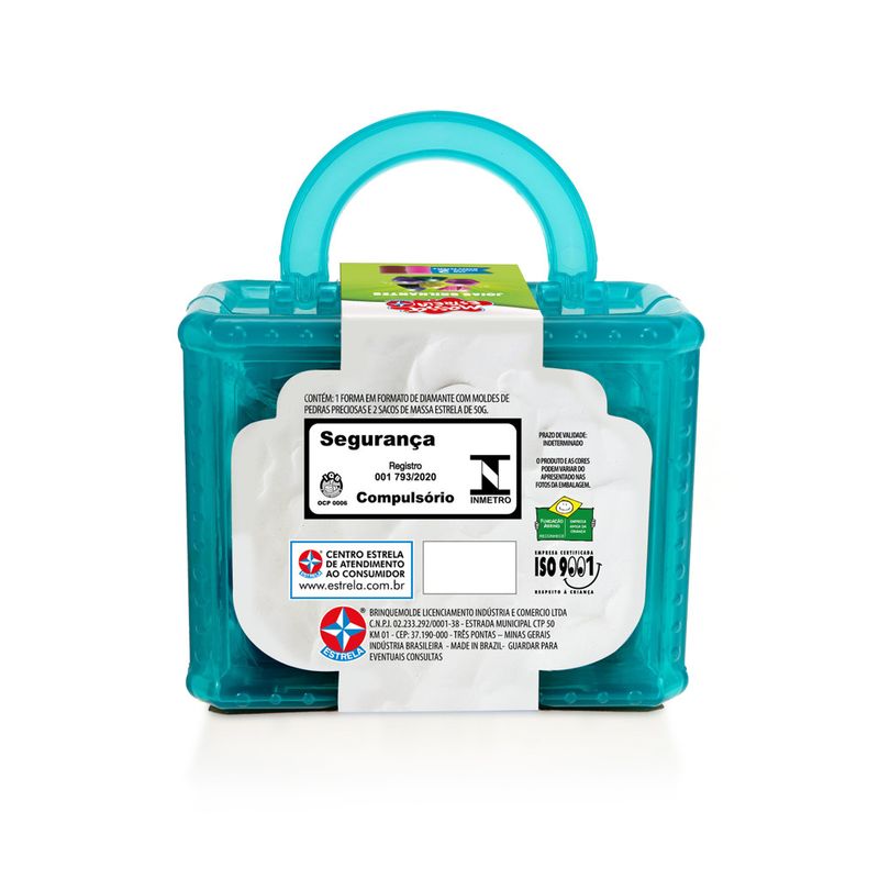 O Kit Joias Brilhantes vem com dois sacos de Massa com glitter para criar jóias e pedras preciosas. Com uma forma em formato de diamante que oferece 6 opções de moldes e ainda dois aneis em plástico com encaixe que permite transformar a Massa moldada em um anel personalizado.