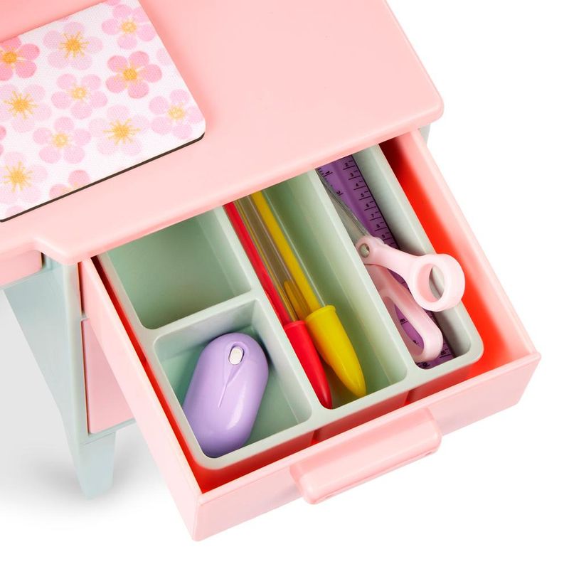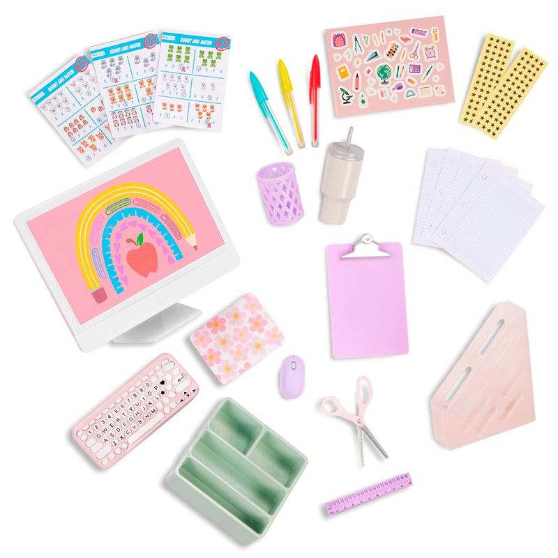 O Conjunto de Mesa Escolar com Acessórios Our Generation é perfeito para criar um cantinho de estudos super estiloso para sua boneca de 46 cm. Com mesa, cadeira giratória e mais de 20 acessórios incríveis, como computador, teclado, mouse, lápis, fichas, adesivos e copo com canudo, esse kit estimula a imaginação e o aprendizado de forma divertida. Com design moderno em tons pastel, é ideal para montar um ambiente escolar ou home office cheio de personalidade. Um brinquedo educativo que combina organização, criatividade e muito charme, ideal para meninas que amam brincar de faz de conta com estilo!