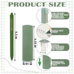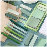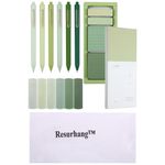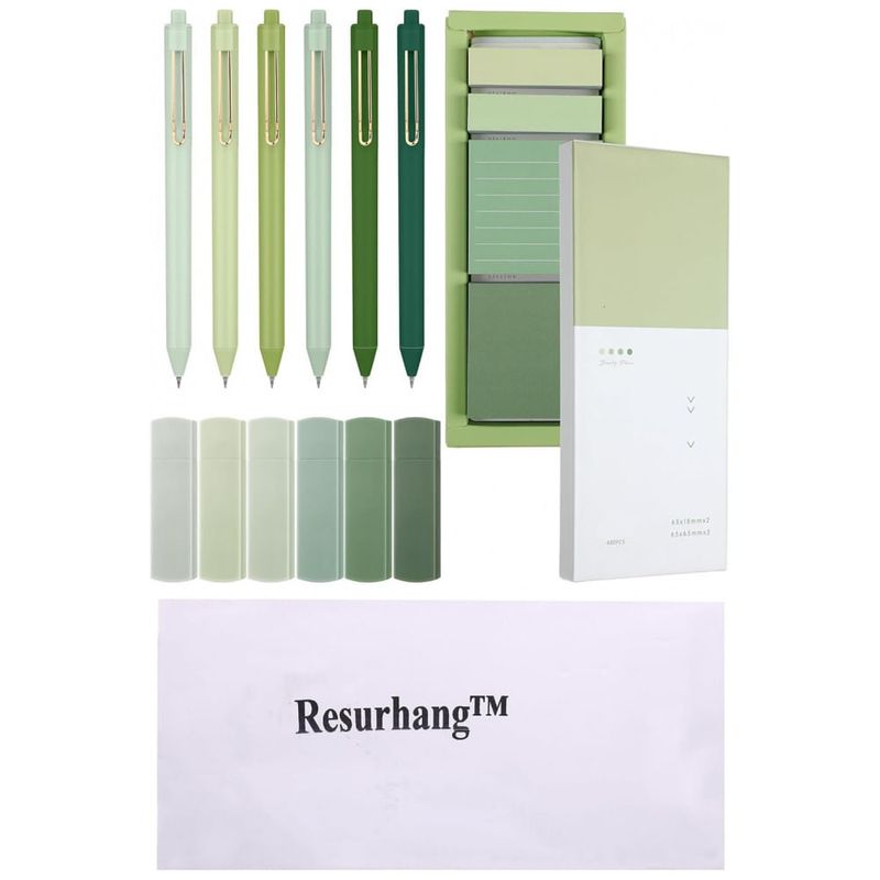 Este conjunto de papelaria estética verde Resurhang reúne itens de escrita, correção e marcação em um kit coordenado para uso diário em ambiente escolar, doméstico ou de escritório. Os componentes incluem canetas de tinta preta retráteis, fitas corretivas e bloco de notas autoadesivas com marcadores de página, todos em tonalidades de verde.
