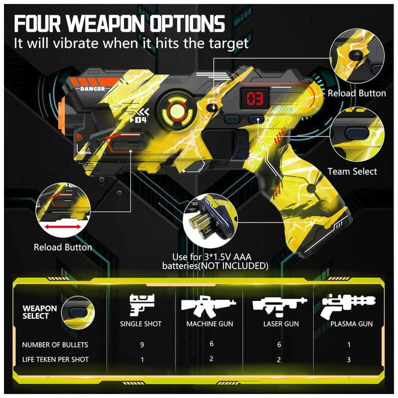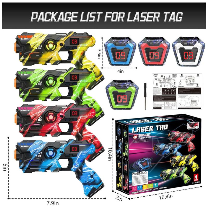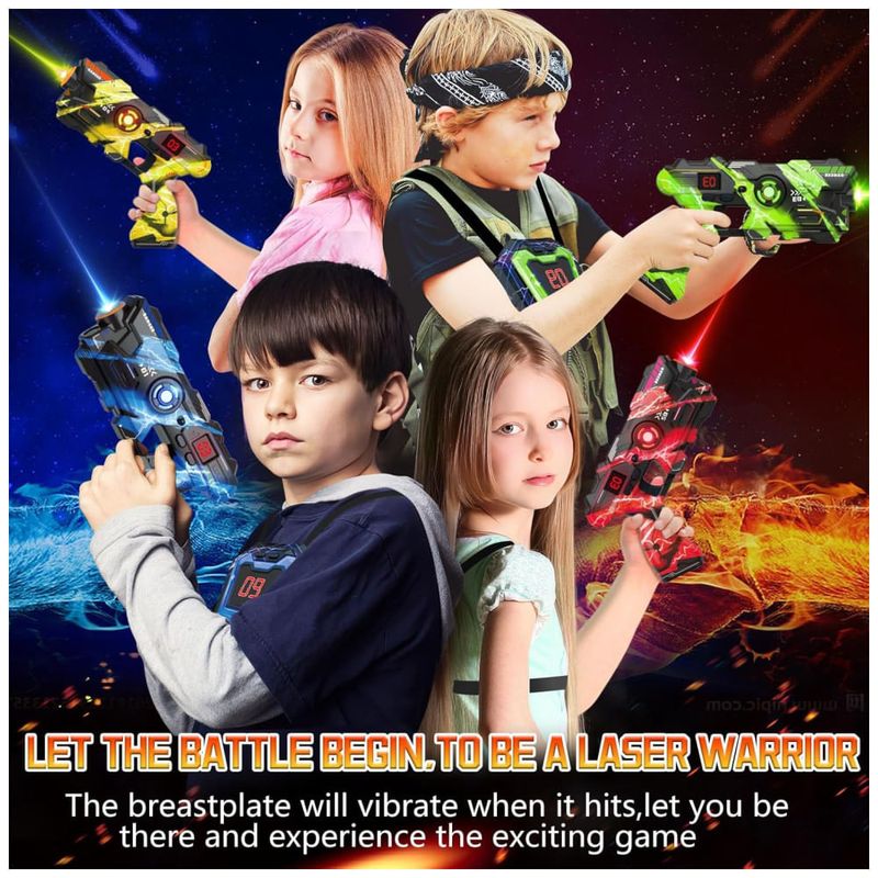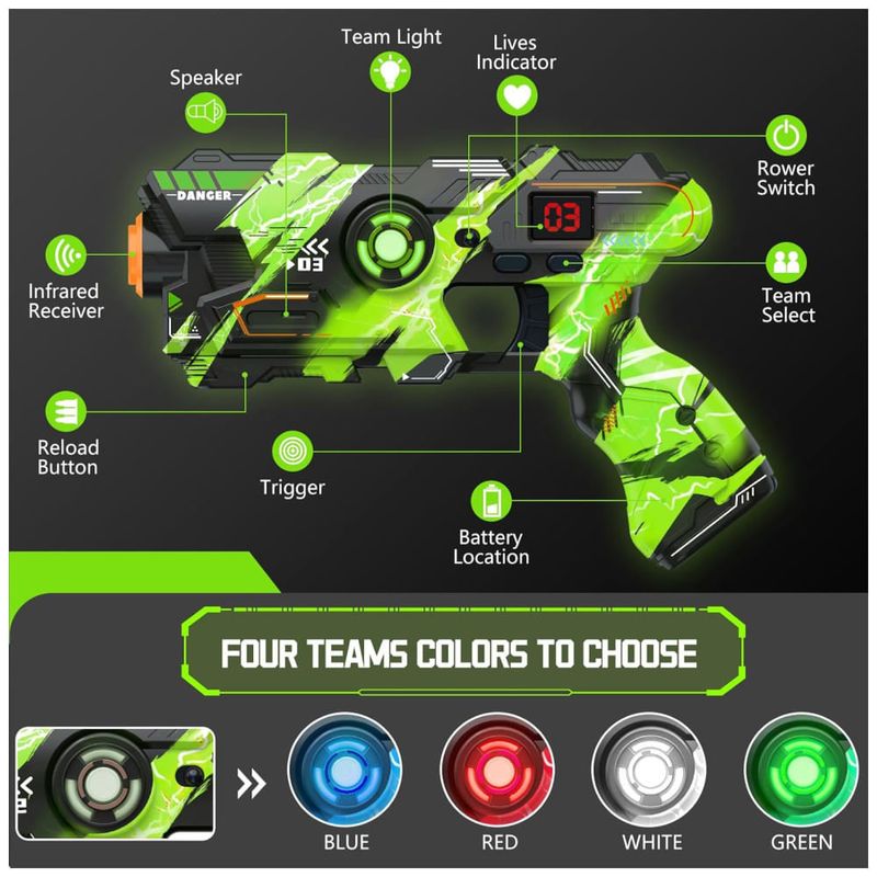 O Mais Recente Conjunto de Armas Infravermelhas: Este conjunto de 4 armas infravermelhas foi projetado para melhorar o trabalho em equipe e a concentração, sendo perfeito para crianças, adolescentes e até adultos. Equipado com 4 pistolas laser infravermelhas (com alcance de mais de 190 pés) e 4 coletes com display LED digital, o jogo se torna muito mais emocionante e a pontuação fica clara em tempo real. Transforme sua casa ou quintal em uma arena de laser tag e aproveite horas de diversão, longe das telas.