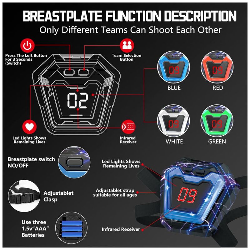 Colete de Alvo com Pontuação LED Digital: Durante o jogo, é fácil verificar o status de suas vidas e a pontuação. O colete multifuncional vem com indicador de vidas, receptor infravermelho, seleção de equipe e botão de liga/desliga (pressione por 3 segundos para ligar/desligar). Cada colete tem 12 vidas e perde um valor de vida sempre que o jogador é atingido. O conjunto inclui 3 pilhas AAA de 1,5 V para cada pistola e colete (não incluídas).