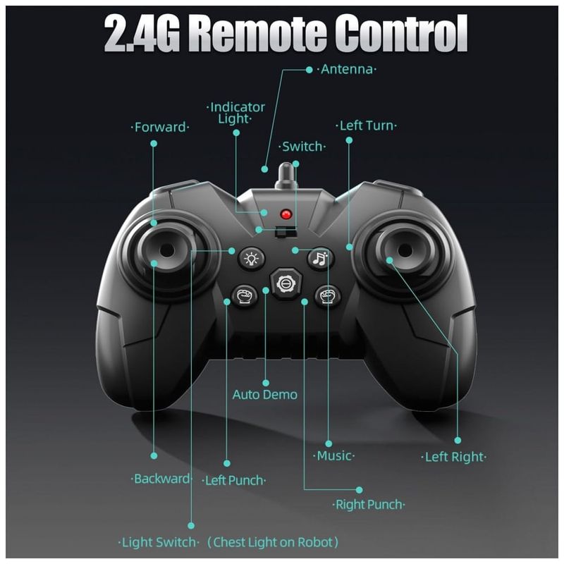 Os robôs utilizam efeitos de luz e som ajustáveis, combinando iluminação em diferentes cores com efeitos sonoros durante os golpes. Os controles remotos são dimensionados para mãos infantis e utilizam comandos simples, adequados para crianças dentro da faixa etária recomendada. A estrutura dos robôs é produzida em material plástico resistente, com cantos arredondados e peso compatível com uso infantil, indicada para sessões de brincadeira em ambientes internos.