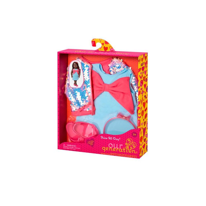 O Conjunto de Roupa Our Generation Jaqueta com Paetês é perfeito para quem quer adicionar brilho e estilo ao guarda-roupa das bonecas de 46 cm. Com uma jaqueta bomber com paetês que refletem a luz a cada movimento, vestido com um grande laço vermelho, tiara combinando e sapatos delicados, esse conjunto oferece um visual moderno e cheio de charme. Fácil de vestir e tirar, suas peças têm fechos práticos que estimulam a criatividade e o faz de conta, permitindo que as crianças misturem e combinem looks para diversas histórias. Eesse conjunto é compatível com a maioria das bonecas Our Generation e acessórios de 46 cm, ampliando as possibilidades de diversão. Transforme o momento do dress-up em uma experiência brilhante e inesquecível com o Conjunto de Roupa Our Generation Jaqueta com Paetês!