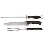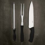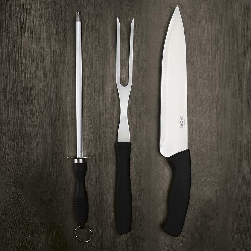 O Conjunto do Assador 3 peças Mor é formado por uma faca, um garfo e uma chaira com lâmina em aço inoxidável, que confere durabilidade e resistência, e cabos pretos em polipropileno que facilitam a higiene e dão firmeza durante o manuseio. A chaira garante que sua faca fique sempre afiada, pronta para servir seus convidados com praticidade e bom gosto!