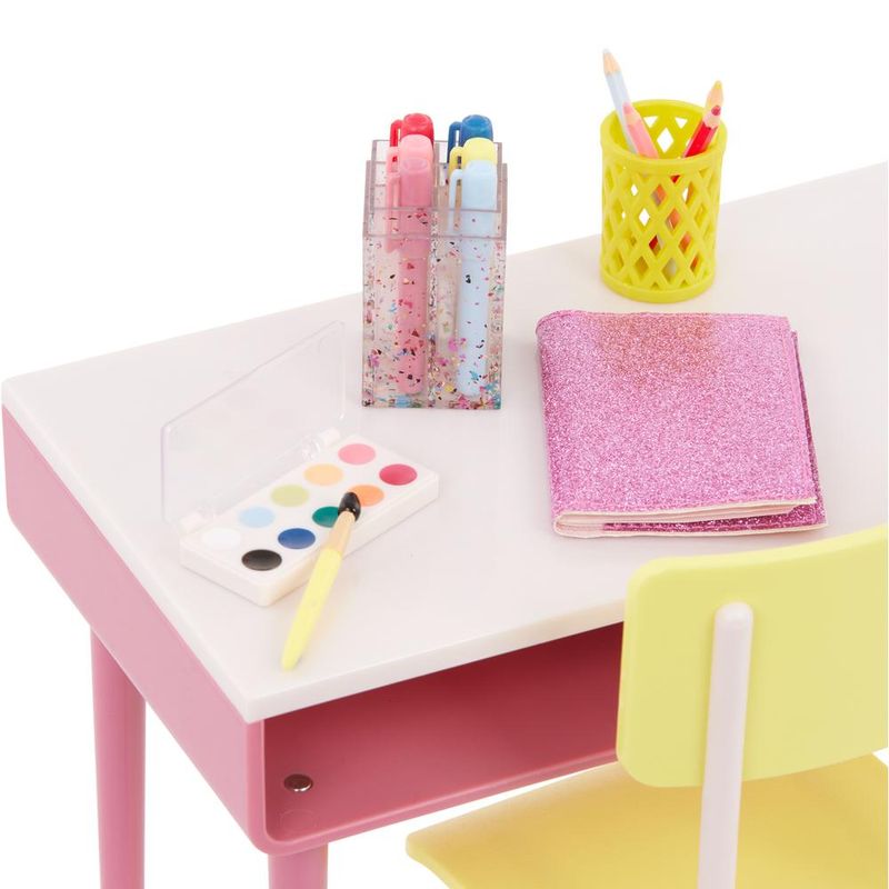 Proporcione às bonecas de 46cm um espaço elegante para escrever, desenhar e sonhar com o conjunto de escrivaninha e cadeira Our Generation Imagination Station! Este conjunto resistente e durável oferece uma escrivaninha em tamanho de boneca com 2 áreas de armazenamento para organizar materiais e acessórios. Além disso, inclui adesivos para as crianças decorarem, aumentando a diversão! Com mais de 30 peças de brincadeira, este conjunto é perfeito para contar histórias emocionantes. Adicione estilo às casinhas de boneca e outros conjuntos de móveis para bonecas.