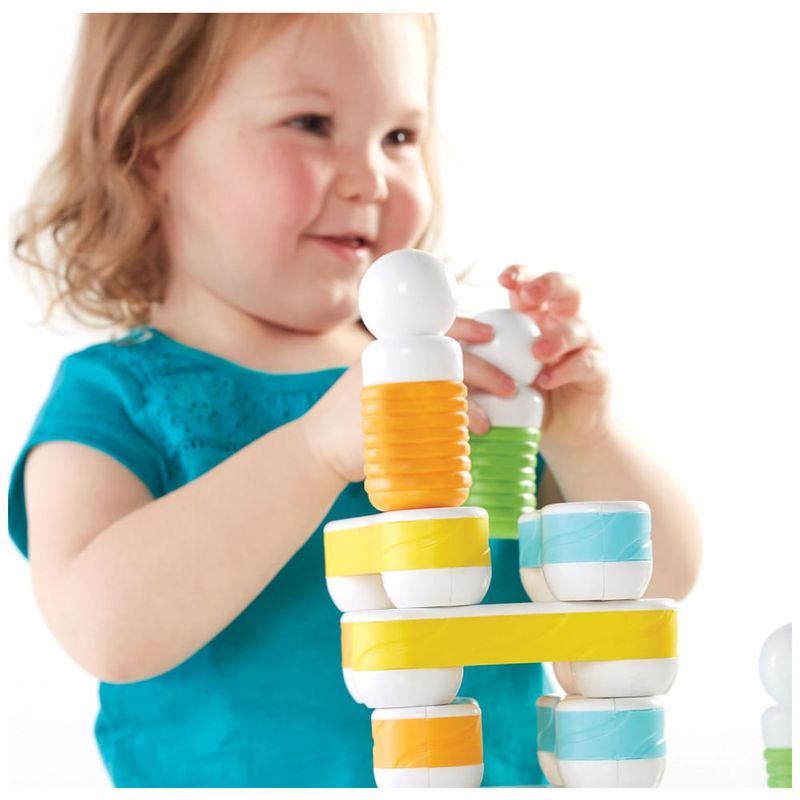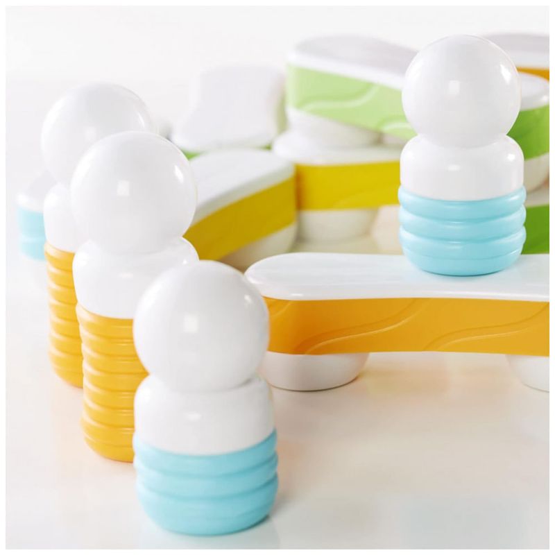 As construções sugerem figuras humanas simplificadas e agrupamentos, incentivando a exploração de padrões, empilhamento, conexões lineares e brincadeiras de faz de conta com personagens. O conjunto faz parte da plataforma Grippies de brinquedos STEM para a primeira infância e inclui guia de criatividade com propostas de montagem em 2D e 3D.?