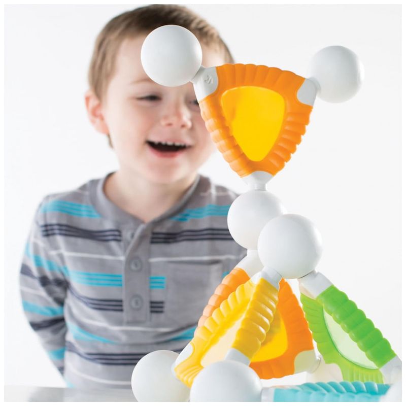 As janelas translúcidas coloridas favorecem atividades com luz natural ou sobre mesas de luz, permitindo observar cores, sobreposições e formas em 2D e 3D. As conexões magnéticas entre barras e esferas possibilitam construções lineares, estruturas verticais e padrões orgânicos, apoiando objetivos de exploração STEM na primeira infância.?