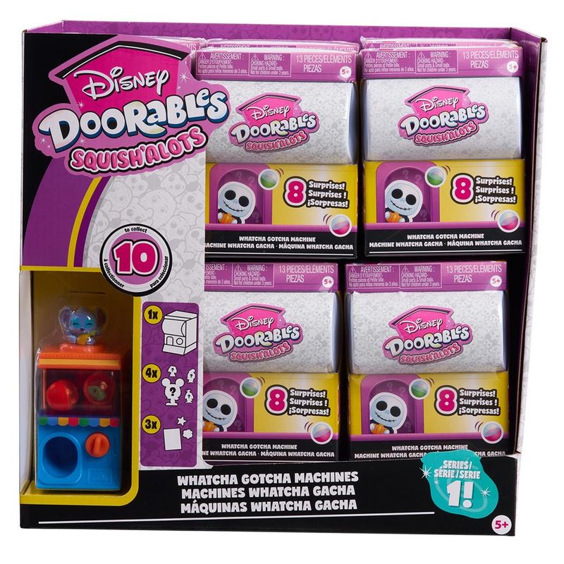 Os Disney Doorables Squish'Alots Whatcha Gotcha Machines oferecem diversão e surpresas a cada descoberta. Cada pacote inclui 8 figuras, incluindo uma máquina de venda automática, adesivos, bonecos e micro figuras em cápsulas. Ao girar o botão, surgem 3 micro figuras e 2 adesivos, trazendo uma nova surpresa a cada vez. A série apresenta 10 máquinas temáticas inspiradas em clássicos da Disney, como Alice no País das Maravilhas, Lilo & Stitch, Toy Story e muito mais. As edições especiais com personagens como Tristeza, Rapunzel, Gato de Cheshire, Oogie Boogie e Stitch formam um arco-íris encantador quando alinhadas. Compactas e perfeitas para exibição, cada máquina é vendida separadamente, garantindo diversão sem fim.