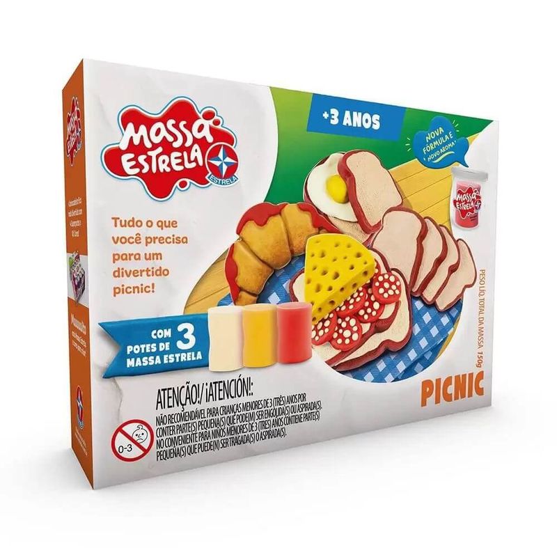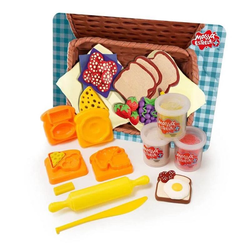 O Picnic com Massa Estrela contém três moldes com mais de 10 possibilidades de formas de lanchinhos, como pão e ovo, pão, queijo e salame e croissant com geleia, além de um cenário de toalhinha e cesta de piquenique. A diversão é garantida na hora do picnic com esse incrível conjunto de Massa Estrela!