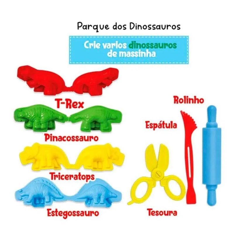 Conteúdo da Embalagem: 4 moldes de dinossauros, 01 rolinho, 01 espátula, 01 tesoura e 03 potes de massinha