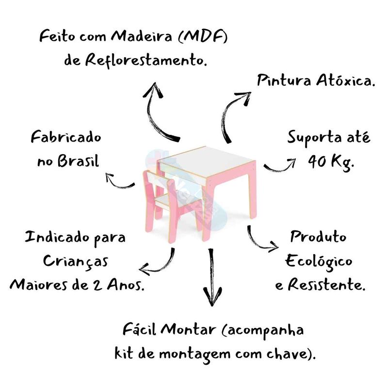 Perfeito para a criança brincar com os amigos, fazer a lição e o lanchinho, e muito mais! Pode ser usado no quarto ou no ambiente em que a criança faz as atividades, seja para a escola ou para lazer. Cadeirinha indicada para crianças com peso até 40Kg.