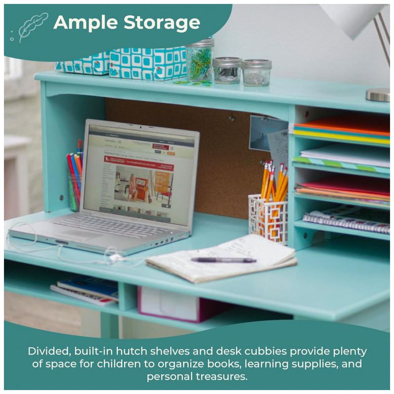A estrutura conta com uma estante (hutch) integrada que oferece amplo espaço de armazenamento organizado. Esta estante possui 5 nichos (cubbies) acessíveis para guardar materiais escolares, livros e objetos pessoais, além de um painel de cortiça para fixação de lembretes e decorativos. Existem orifícios estratégicos para passagem e organização de cabos e fios eletrônicos, possibilitando o uso de computadores e outros dispositivos de forma ordenada.