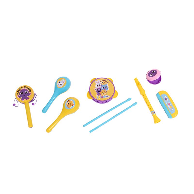 Bolofofos Kit Bandinha. É um conjunto com várias peças musicais para as crianças se divertirem e iniciarem no universo musical. Ele vem com 1 castanhola, 1 par de baquetas,1 tambor com alça, 1 pandeirinho, 1 kabuletê, 1 gaita e 1 flauta.