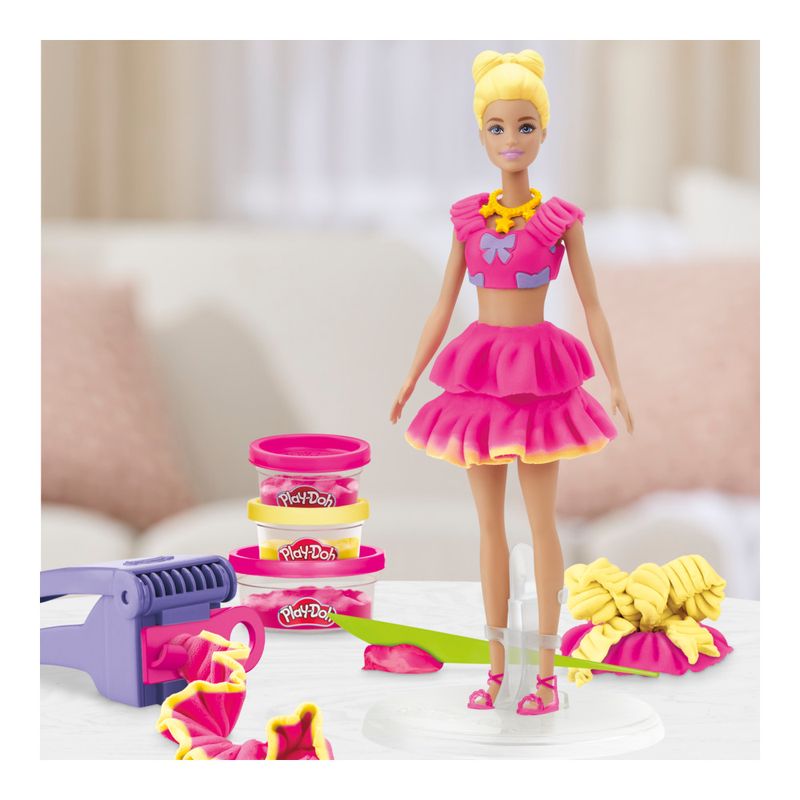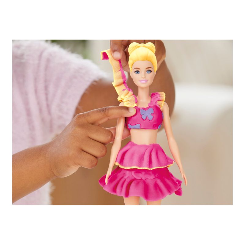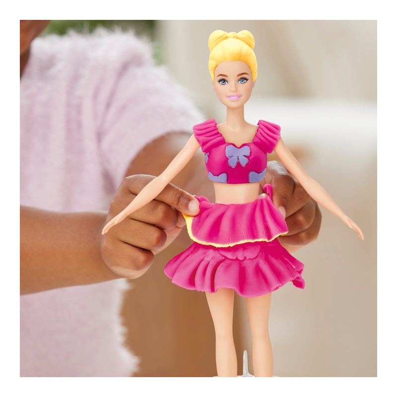 Crie estilos super fofos com o conjunto Babados e Laços! É fácil e divertido criar roupas de Barbie com Play-Doh usando este kit de arte e artesanato. Basta colocar a boneca no suporte, usar a folha de padrões Play-Doh e os cortadores para criar vestidos da Barbie e vesti-la das formas mais criativas que imaginar. Dê a ela diferentes penteados Play-Doh com o molde de cabelo, ou as crianças podem criar seus próprios estilos manualmente. Complete o visual com acessórios da Barbie, como bolsa e sapatos. Mantenha a brincadeira criativa com 2 potes de massa de modelar Play-Doh para adicionar ainda mais detalhes. Um presente incrivelmente estiloso para crianças que amam os conjuntos da Barbie e os brinquedos Play-Doh! Copyright 2025 Mattel. PLAY-DOH and HASBRO and all related trademarks and logos are trademarks of Hasbro, Inc.