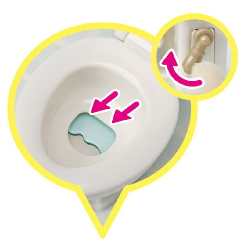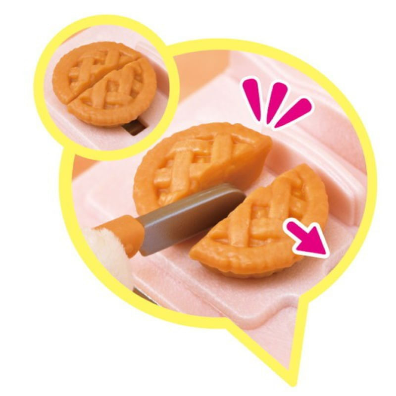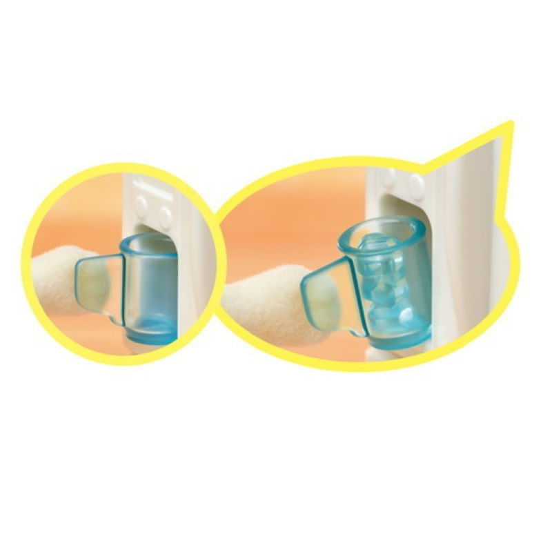 O Conjunto Primeiros Móveis Divertidos permite que você gire a maçaneta do fogão para revelar uma chama. Coloque a torta de maçã ou baguete na mesa de corte e corte-a com a faca. Coloque uma xícara no dispensador de gelo da geladeira para fazer o gelo sair. Abra a torneira da pia para que a ""água"" saia. Puxe a alça do vaso sanitário para ""dar descarga"".