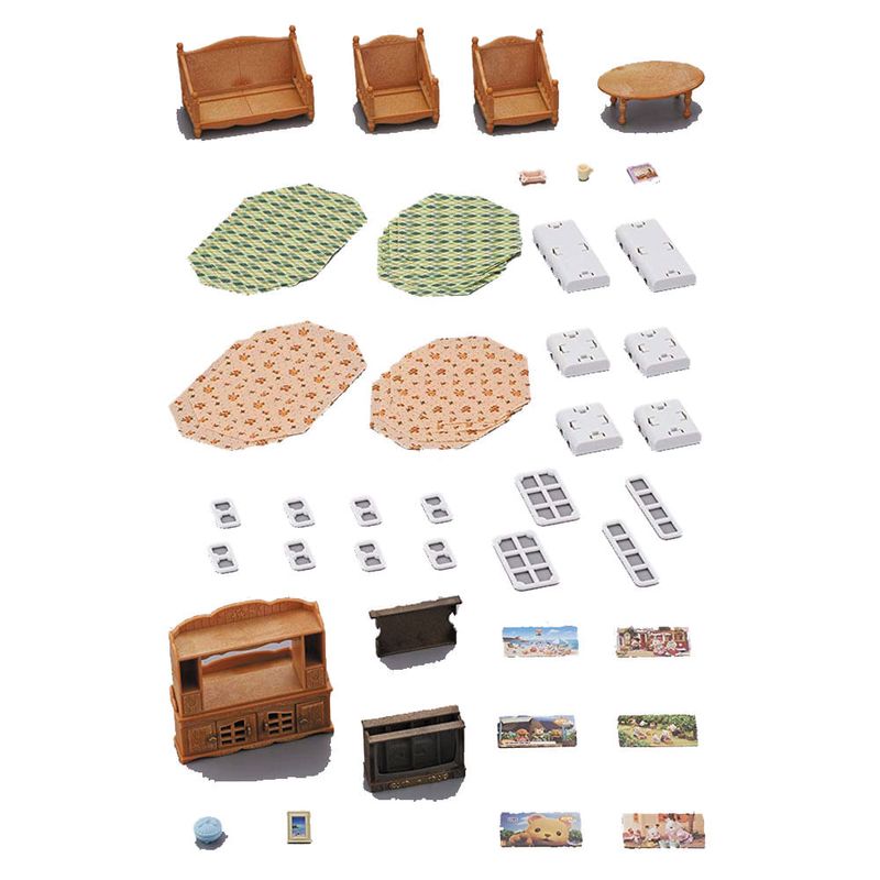 O Conjunto Sala de Estar Confortável - 20 Peças - Sylvanian Families da Epoch inclui um sofá, poltronas, mesa baixa, TV e armário de TV. O Conjunto Sala de Estar Confortável apresenta folhas de imagens dentro da TV que podem ser retiradas e substituídas para alterar a imagem da TV. Os materiais substituíveis incluídos para o sofá e poltronas permitem alterações de design fáceis. Usando o design unificado, combine com o Conjunto Sala de Estar Confortável e outros personagens para criar uma divertida cena de sala de estar em que toda a família pode se unir (vendida separadamente).
