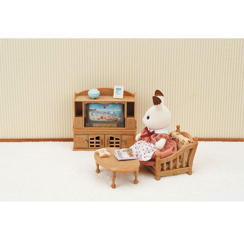 Espaçosos e aconchegante, essa sala é composta de sofá e duas poltronas com almofadas, mesa de centro, estante, tv com 6 cenas, porta-retratos, bomboniére, cestinha, caneca e revista. Conjunto de móveis com acessórios: sofá, poltronas, mesa, material substituível, TV, armário de TV, moldura fotográfica, etc. O estofado do sofá e poltrona pode ser substituído. O desenho da TV pode ser substituido, alterando a imagem da TV. Estimula o jogo de papéis imaginativo por crianças.