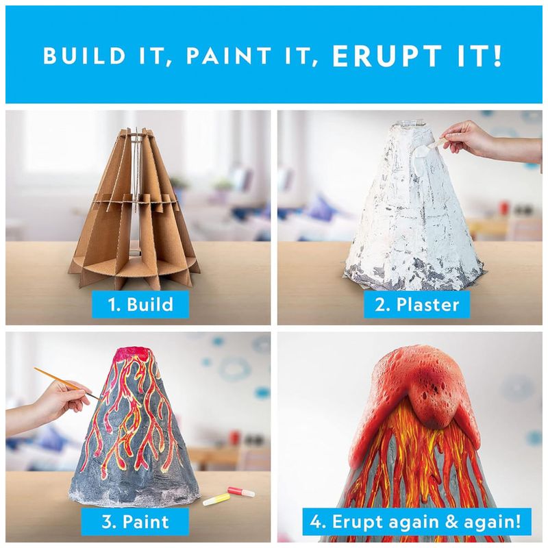 CONFIGURAÇÃO FÁCIL Instruções para crianças tornam este vulcão enorme fácil de fazer e entrar em erupção. Coloque o envoltório de gesso sobre a moldura, adicione gesso e, quando estiver seco, pinte o e exploda novamente e novamente
