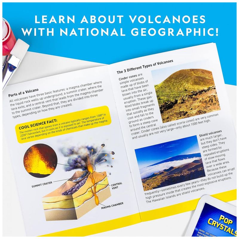 MAIS ERUPÇÕES, MAIS DIVERSÃO Este kit de ciências infantil vem com 3 pacotes de pó de erupção mais cristais pop que adicionam sons emocionantes de crepitação. Instruções para mais erupções de materiais domésticos também estão incluídas.