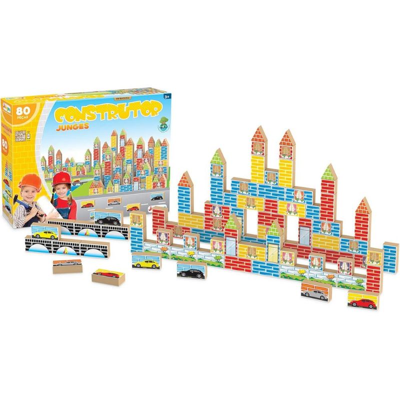 Construtor Junges é um brinquedo de construção. Elaborado a partir de bloquinhos em madeira de reflorestamento (MDF) em 15mm de espessura, é composto com peças de tamanhos e desenhos diferentes para montar a cidade que desejar. Acompanha cartela de adesivos coloridos para decoração dos bloquinhos.