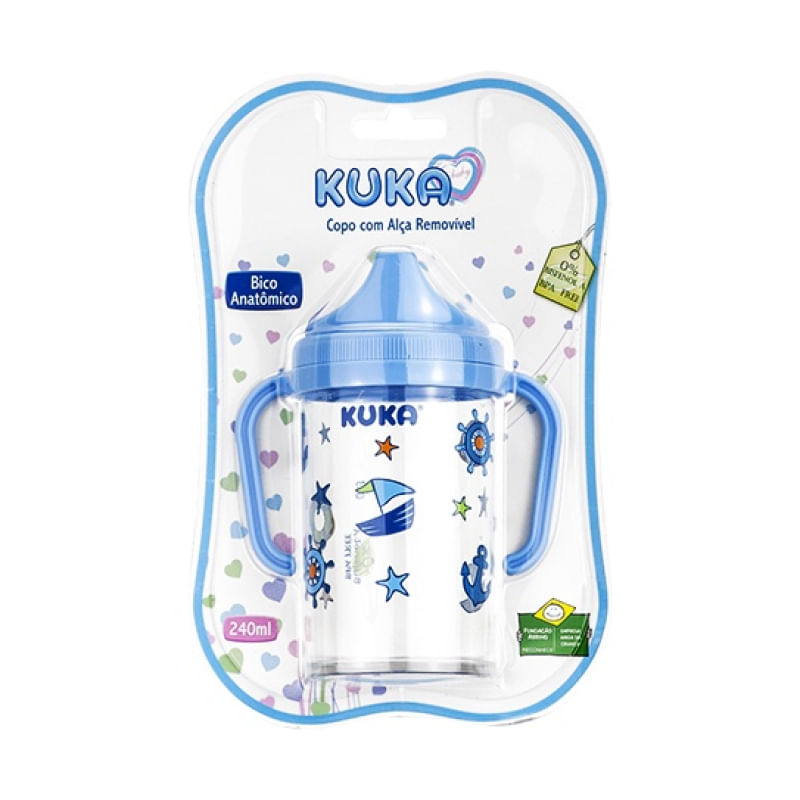 O Copo com Alças Removível Kuka foi especialmente desenvolvido para treinar o bebê que está aprendendo a beber. A alça é adequada ao tamanho das mãos do bebê e possui uma guia para encaixe no copo, deixando-a na posição corretaem relação ao bico. O copo também pode ser utilizado sem a alça. Para removê-la, basta tirar a tampa que é rosqueável. É fácil de limpar, pois não retém resíduos alimentares e não tem rebarbas cortantes.