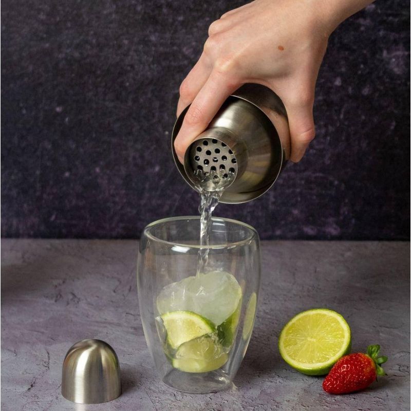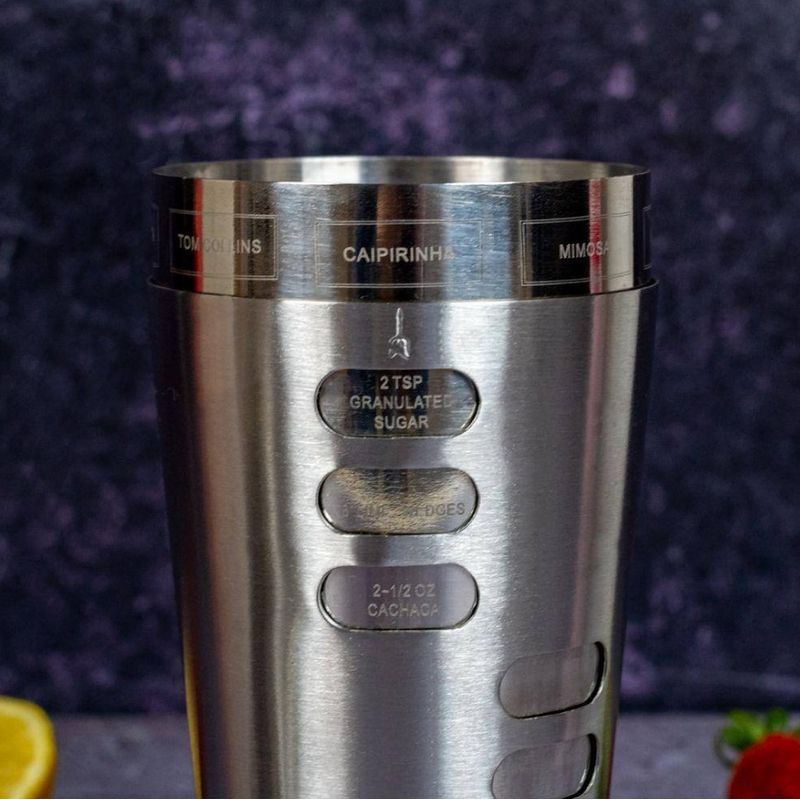 A sua resistência à corrosão e propriedades higiênicas e estéticas fazem do aço inox um material muito atrativo, além de manter suas propriedades mesmo quando submetida a elevadas ou baixas temperaturas. Reciclável e de grau alimentício. Nossa coqueteleira é feita inteiramente em aço inoxidável com detalhes que trazem as receitas dos drinks. Sua tampa é justa e possui um filtro embutido que te permite agitar e servir com profissionalismo sem esforço. Adicione os ingredientes no copo, adicione o gelo, feche o conjunto e bata no fundo da coqueteleira para vedar bem. Bata ou agite seu coquetel vigorosamente. O modo de bater influência na textura, diluição e temperatura. Sirva a bebida. A coqueteleira não irá vazar, a vedação é confiável. A sua tampa não gruda e se solta com facilidade. Lembre-se a quantidade de batidas e o modo de bater vai influenciar na textura, diluição e temperatura do coquetel. E um tapa na borda do copo facilita abrir. É lavável na máquina de lavar louças. Os produtos indicados para a limpeza são: detergentes suaves ou neutros e água morna. Aplique com uma esponja macia e o sabão neutro. Não utilize abrasivos ou palha de aço. Medidas: C-9cm L-9cm A-25cm e Capacidade: 600ml