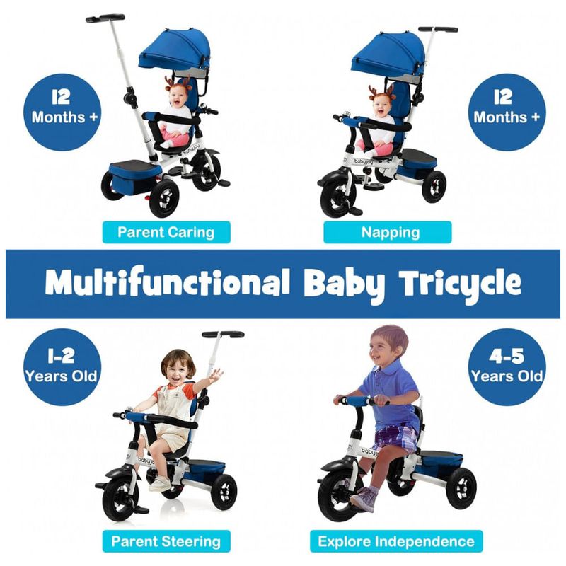 Triciclo 6 em 1 Nosso triciclo pode ser como triciclo infantil, triciclo de direção, triciclo para aprender a andar, triciclo clássico para atender as crianças em diferentes estágios. Você pode desmontar o toldo, guardrail e pushrod traseiro de acordo com a altura da criança. É adequado para crianças de 19 meses a 5 anos e é o melhor presente para crianças.