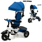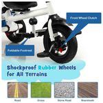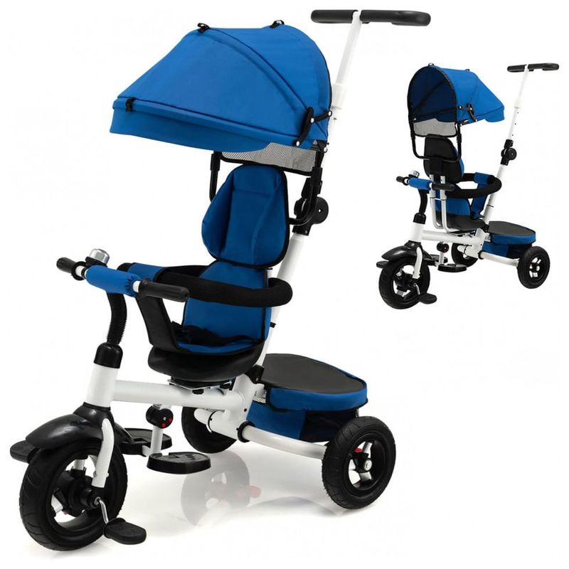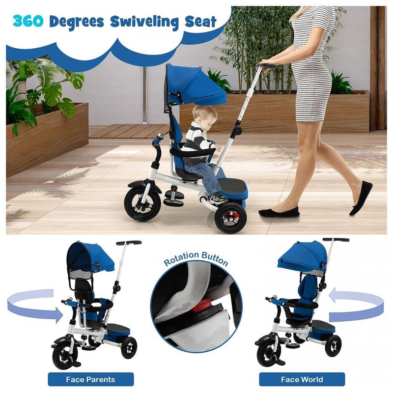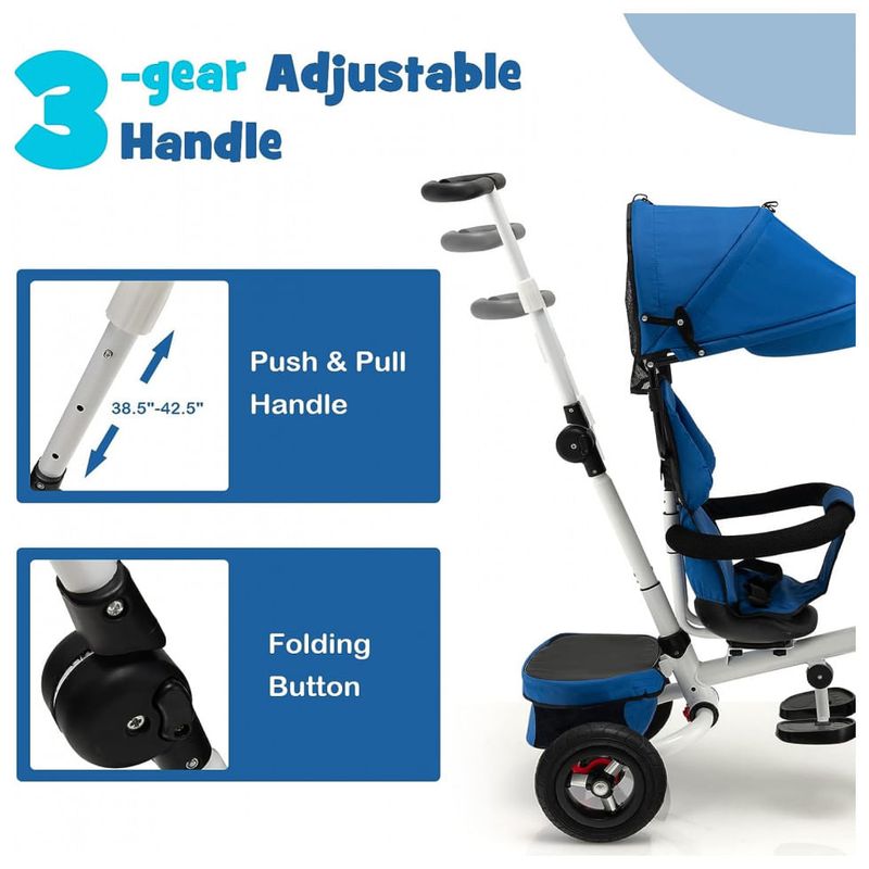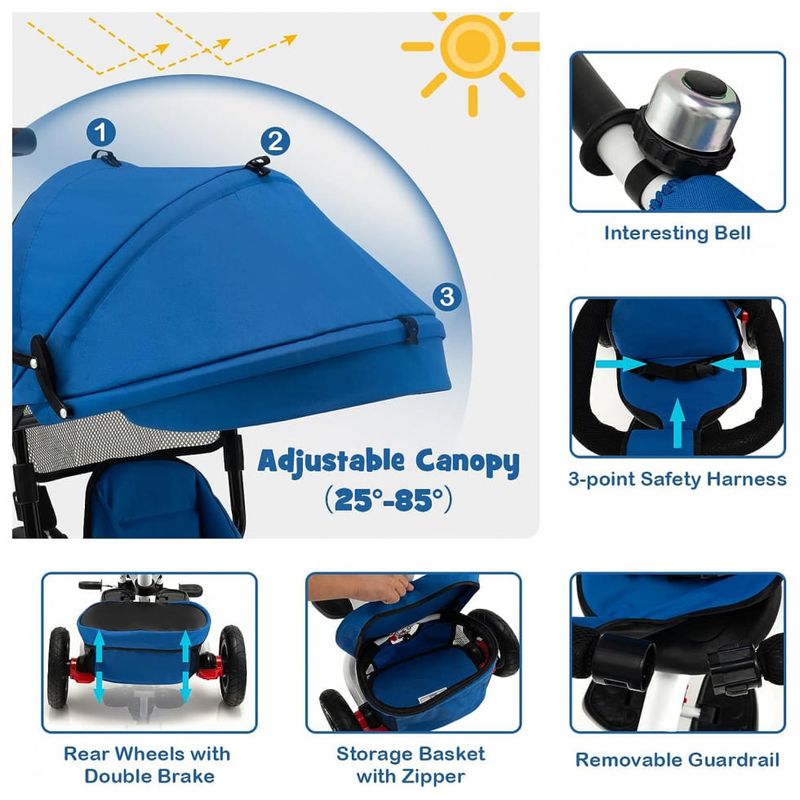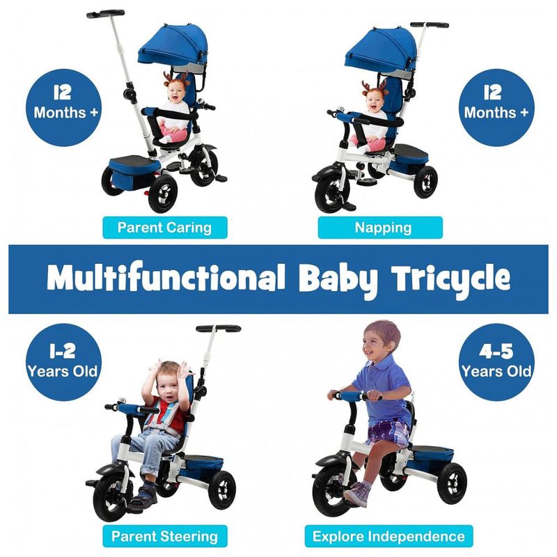 Triciclo 6 em 1 Nosso triciclo pode ser como triciclo infantil, triciclo de direção, triciclo para aprender a andar, triciclo clássico para atender as crianças em diferentes estágios. Você pode desmontar o toldo, guardrail e pushrod traseiro de acordo com a altura da criança. É adequado para crianças de 19 meses a 5 anos e é o melhor presente para crianças.