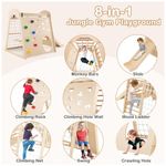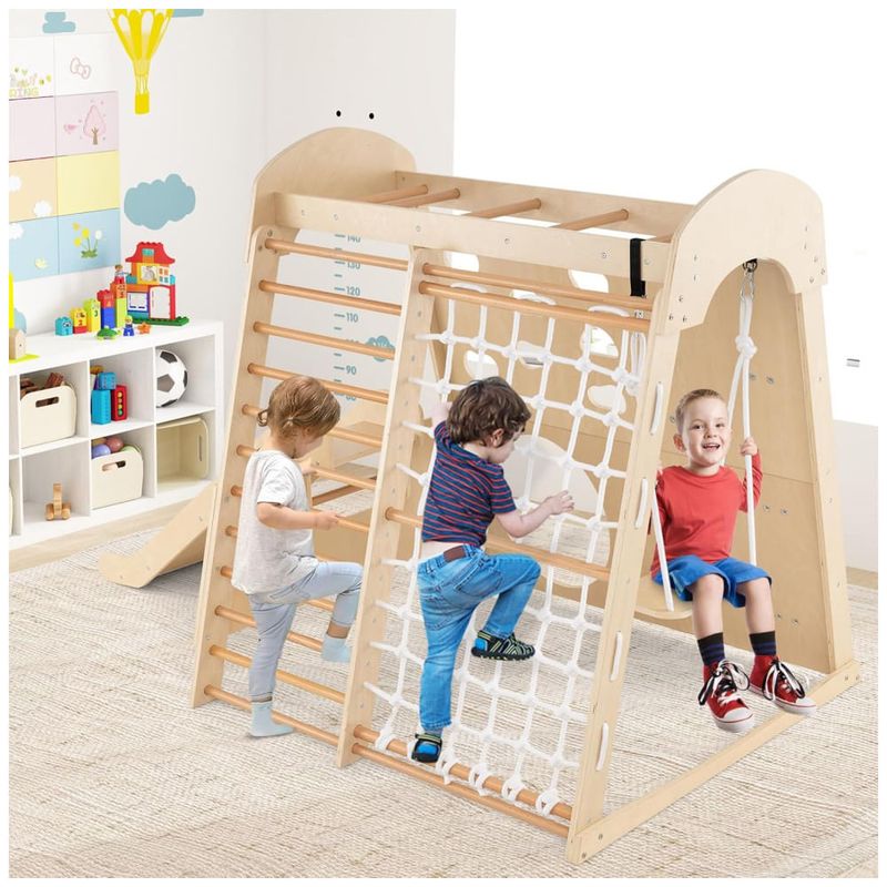 Transforme sua casa em um playground divertido com o playground indoor 8 em 1 da Costzon! Feito para brincadeiras ativas, este playground de madeira inclui escorregador, escada de madeira, rede de escalada, balanço, parede de escalada, túnel rastejante e barras de macaco, garantindo horas de entretenimento. O escorregador de 3 seções possui zona de amortecimento e corrimãos para maior segurança, podendo ser desmontado facilmente. Feito de madeira resistente e sem lascas, oferece durabilidade e ambiente de jogo seguro. Sua estrutura trapezoidal suporta até 4 crianças. Este conjunto promove força, coordenação, equilíbrio e habilidades sociais, sendo um presente ideal para crianças de 3 anos. Acompanha certificação ASTM e CPSIA.